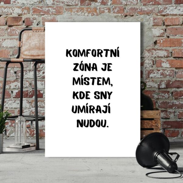 Slova na tomto plakátu mají sílu promluvit přímo k vašemu nitru. Zamyslete se nad tím, jak mnoho lidí stráví svůj život v pohodlné zóně, kde pohodlně pobývají, ale jejich sny utichají a umírají. Každý z nás má schopnost snít velké sny, toužit po vzrušení a růstu, ale často jsme svázáni pouty pohodlí.